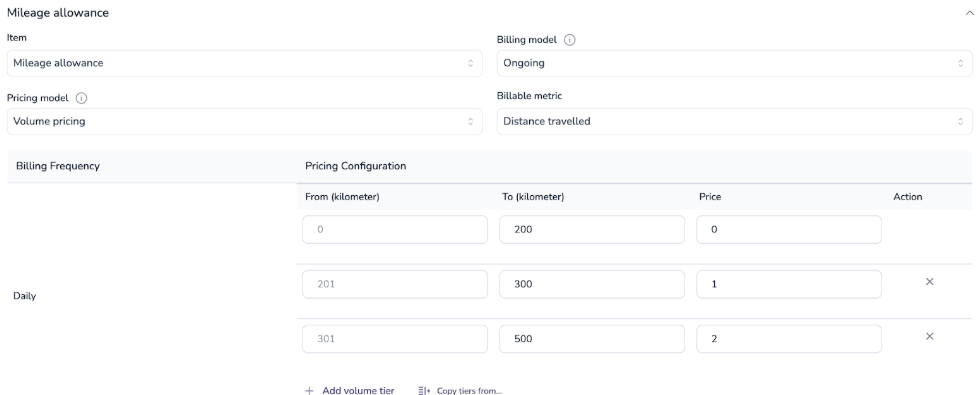 Once these are set, you can define pricing tiers based on your preferred billing frequency (e.g., daily, weekly, monthly).