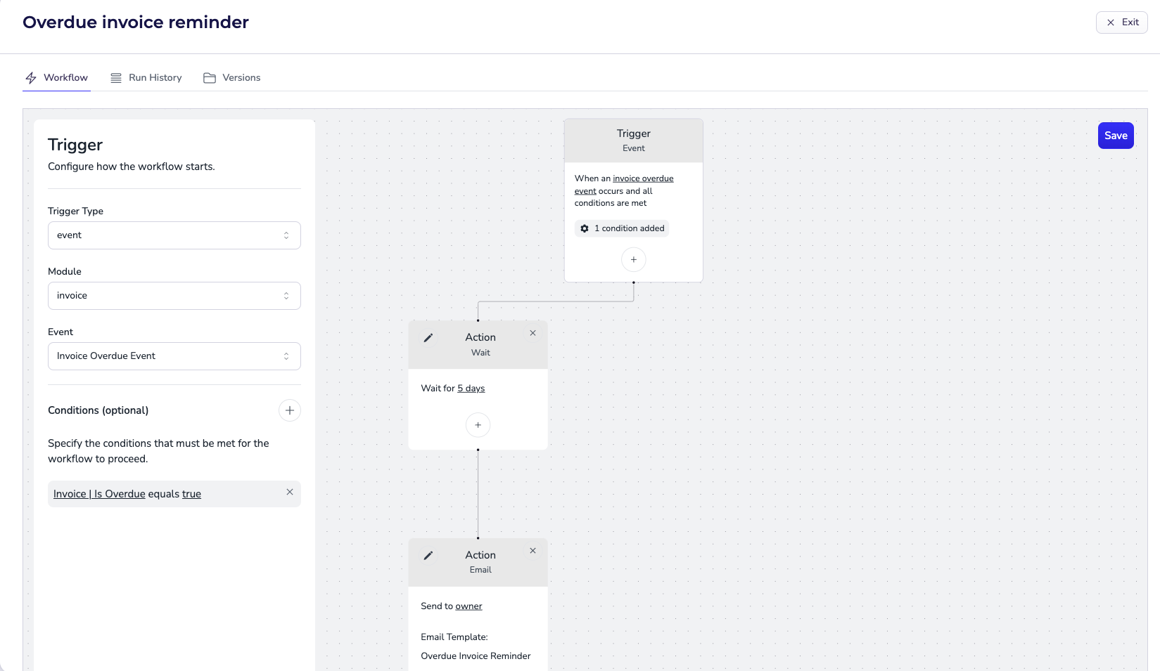 With workflows, you can automate actions like sending a copy of an invoice to a customer when it is generated.